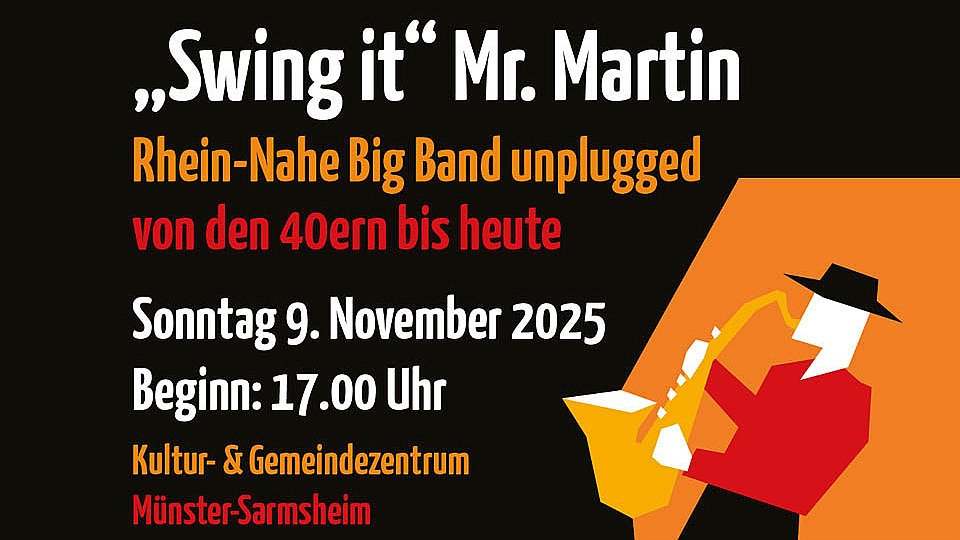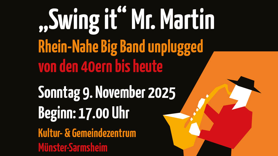 NEU: Swing it, Mr. Martin! Die Rhein-Nahe Big Band unplugged – Swing von den 40ern bis heute: Klassiker von Miller, Goodman, Dorsey, Ella & Sinatra sowie moderne Evergreens wie „Can’t Take My Eyes off You“ und „Downtown“ in eigenen Big-Band-Arrangements. Eintritt frei, Spenden zugunsten der Jugendarbeit des Musikvereins erbeten.