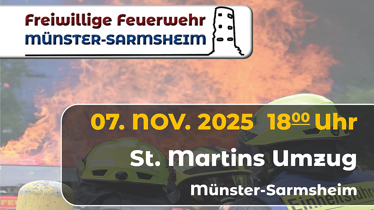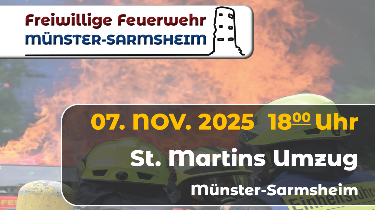 Auch in diesem Jahr findet wieder der bei den Kindern allzeit beliebte St. Martins Umzug der Ortsgemeinde Münster-Sarmsheim statt. Um 18:00 Uhr startet der Umzug durch die Straßen von Münster-Sarmsheim, vom Lindenplatz zum Kultur– und Gemeindezentrum. Die Feuerwehr unterstützt wieder die Ortsgemeinde bei der Durchführung und sorgt für Speis und Trank.