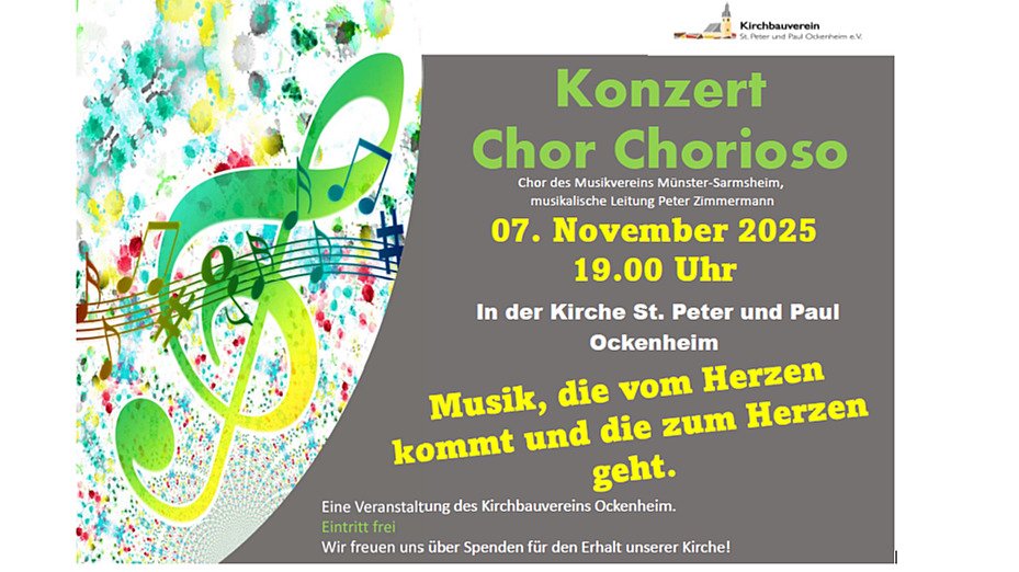 Der Chorioso singt unter der musikalischen Leitung von Peter Zimmermann ein Chorkonzert zugunsten des Kirchenbauvereins Ockenheim. Chormusik vom Feinsten. Lassen Sie sich überraschen.