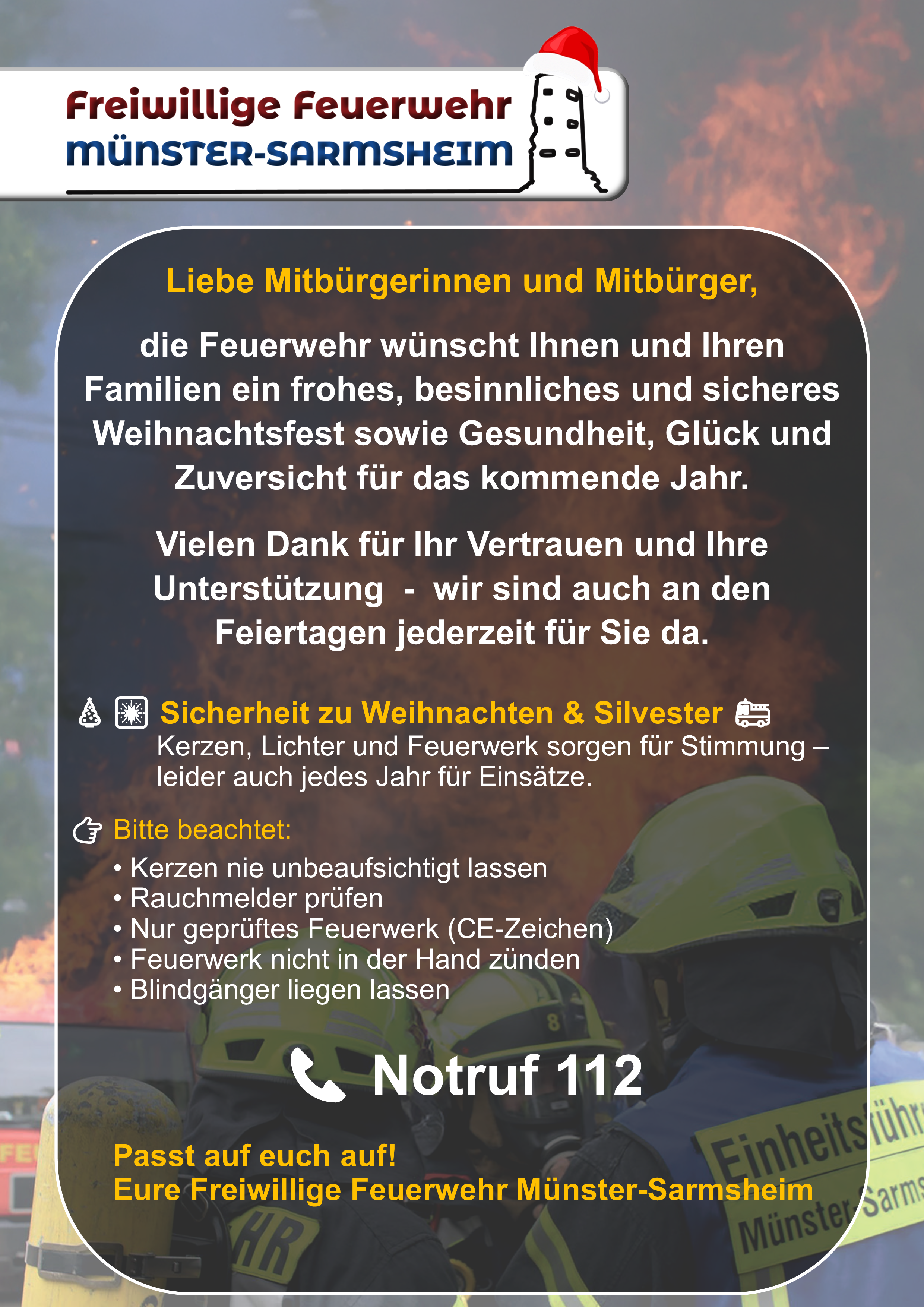 die Feuerwehr wünscht Ihnen und Ihren Familien ein frohes, besinnliches und sicheres Weihnachtsfest sowie Gesundheit, Glück und Zuversicht für das kommende Jahr.